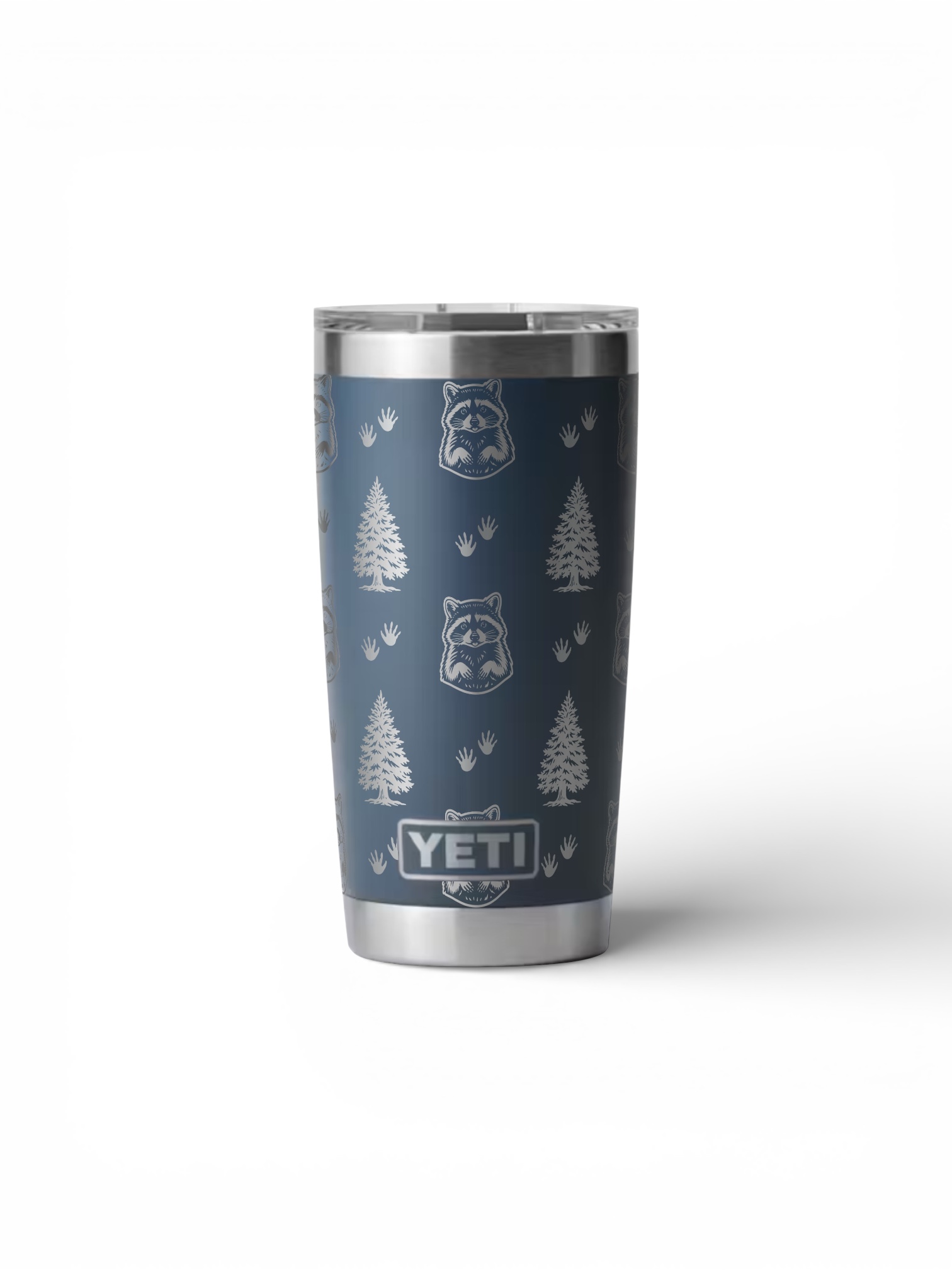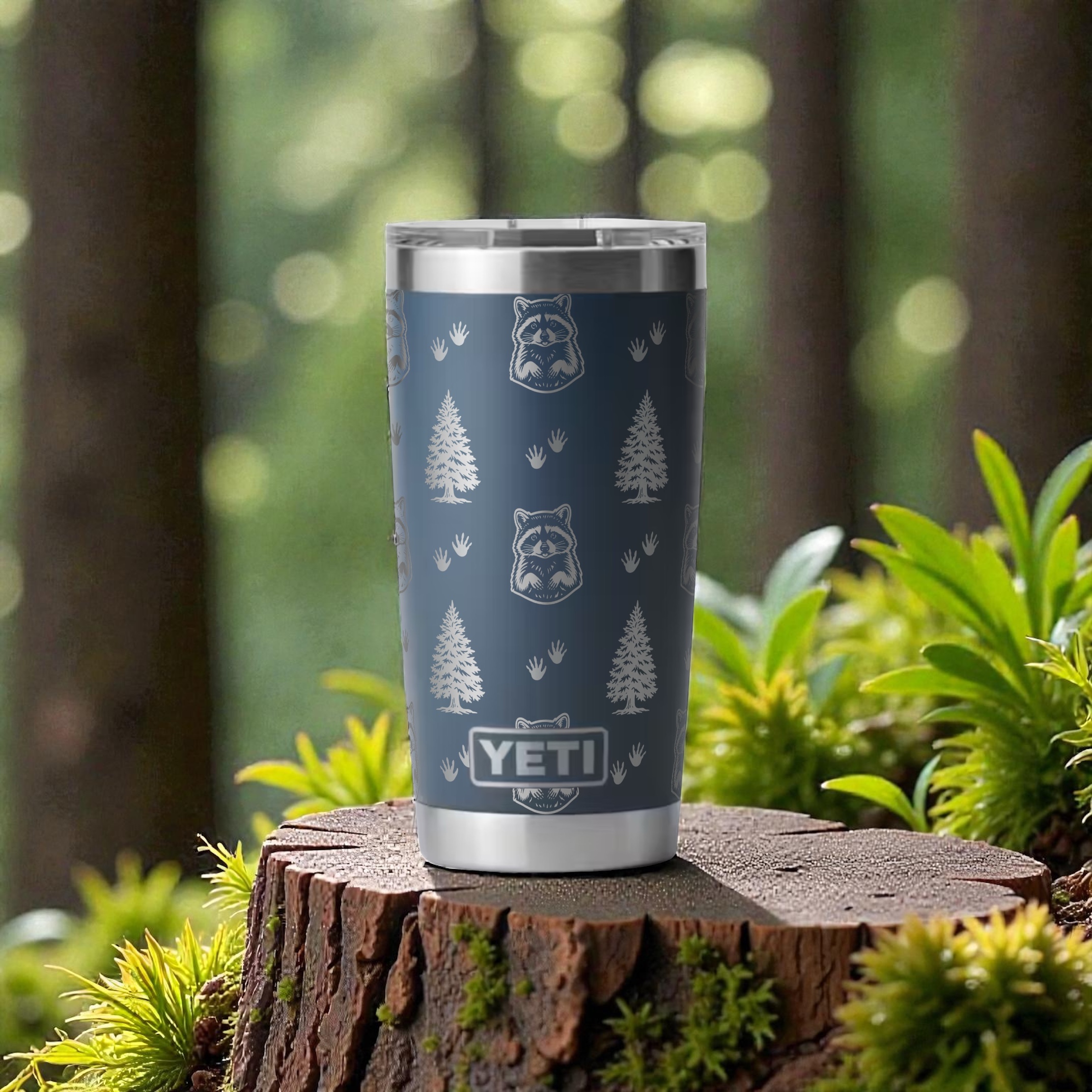 Show off your love for the forest’s cleverest resident with this unique, custom-engraved 591 ml (20 oz) YETI Rambler Tumbler! This tumbler features a charming, all-over pattern of mischievous raccoon faces, classic pine trees, and subtle little paw prints.